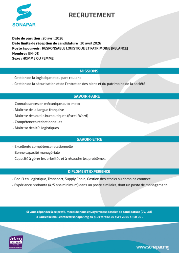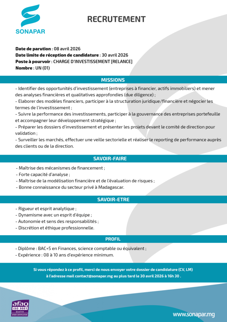 Veuillez nous envoyer votre candidature à l’adresse contact@sonapar.mg